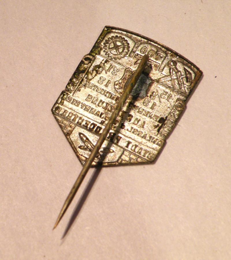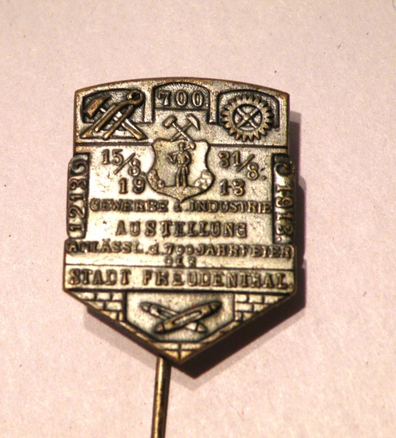 An unusual tinny pin badge the like of which I cant find another example, it is a 700 year commemoration of the German town of Freudenthal, it carries the dates of 1213 to 1913 and centres around trade and industry, there are other possible dates and text to the front, it measures 1.75 long and comes in very good condition for its age.