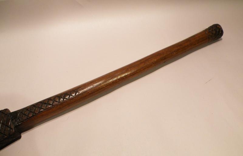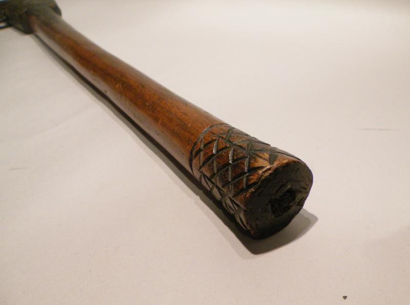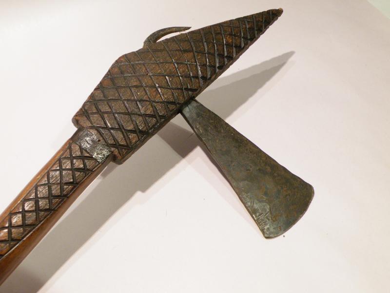 An old African tribal axe with decorated carved shaft and hand wrought blade. I cannot find an exact match for this axe, however it is very similar to the ceremonial axes from Tanzania.