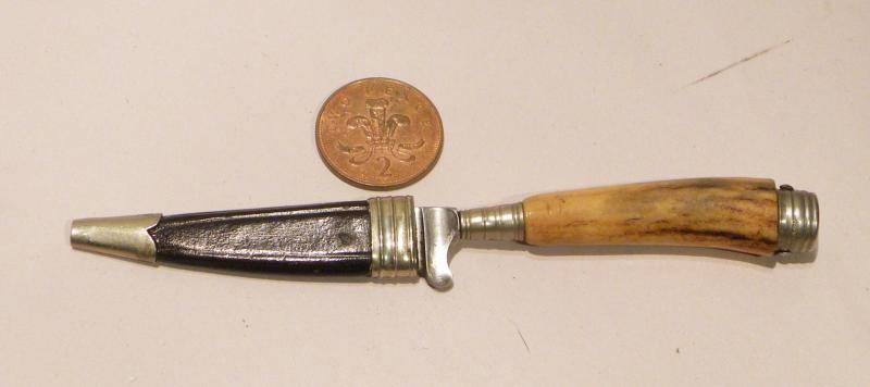 A beautiful miniature dagger, probably a salesman sample of the Hunting dagger by J H Prima Solingen Germany. It has a white metal pommel with a stag horn grip, a high-quality steel blade with makers mark and its original black leather and white metal sheath, all measuring just 5.5 inches in total. It comes in excellent condition; blade has been sharpened at some point.