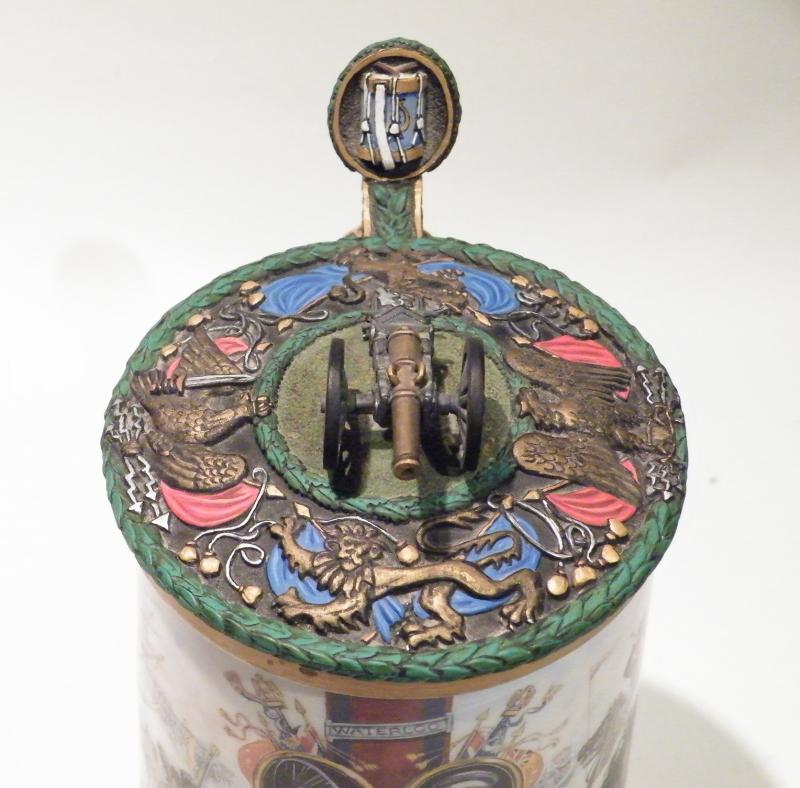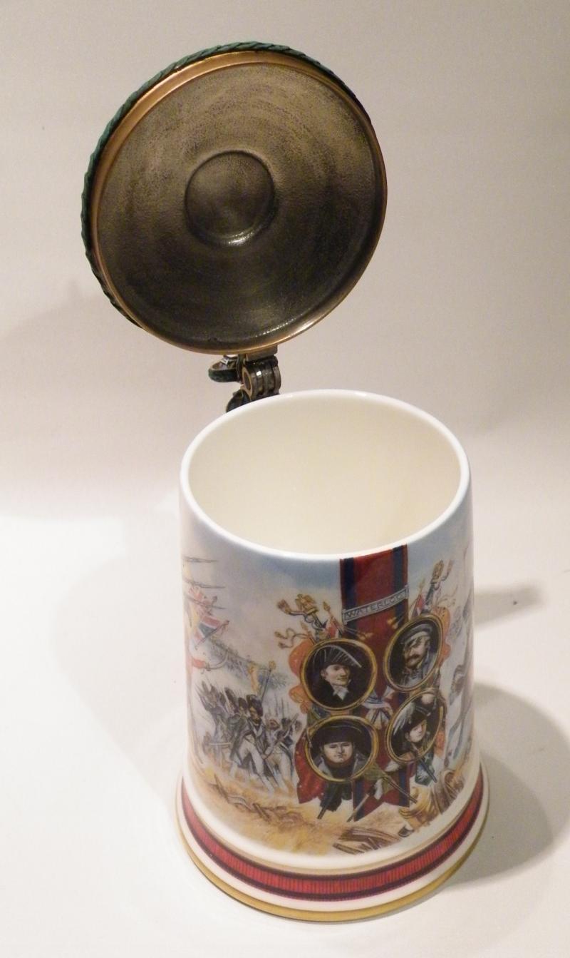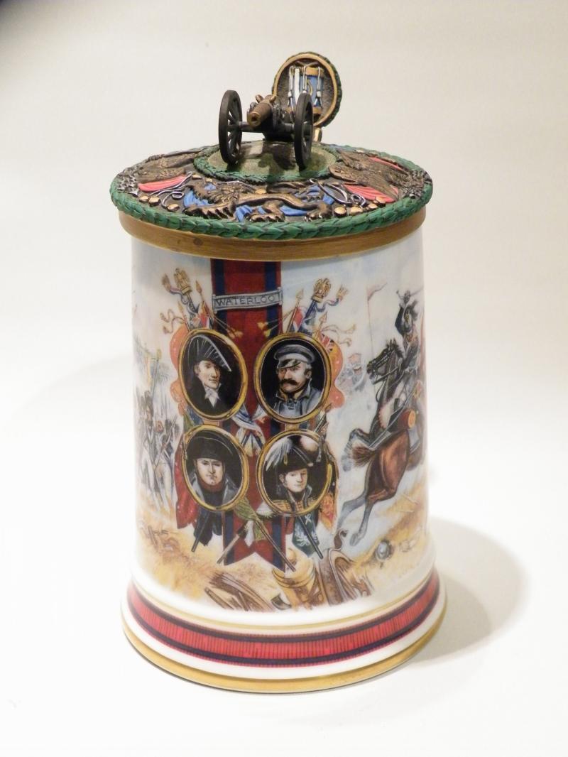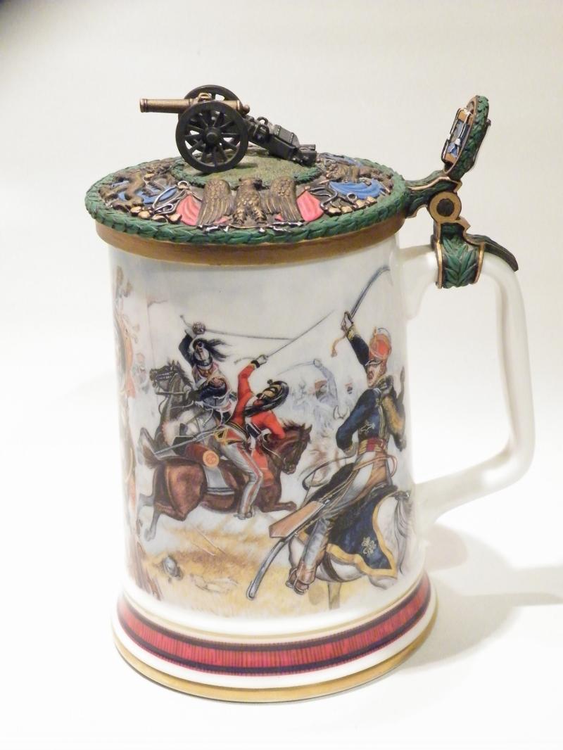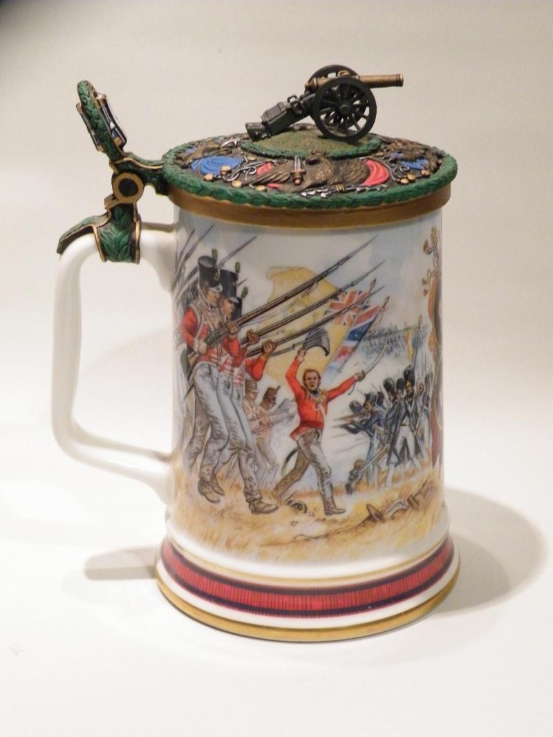 This super quality ceramic tankard with a highly decorated pewter lid was made by Royal Doulton for The Franklin Mint and was retailed via the Waterloo museum, it depicts scenes and generals from the Battle of Waterloo and has a cannon finial, well made and nicely detailed this tankard stands approx. 7.5 inches at the highest point and comes in very good condition.