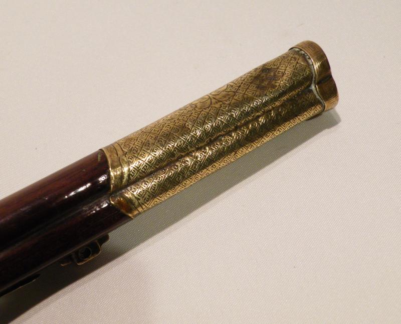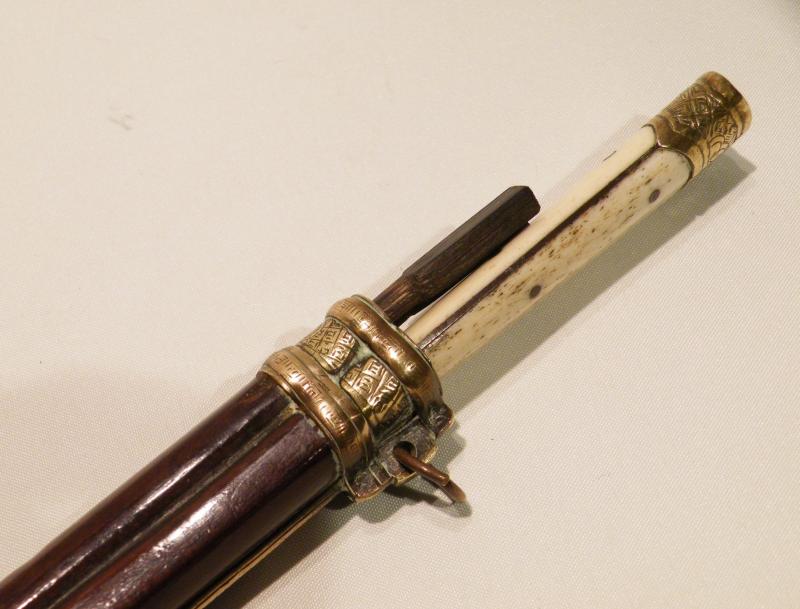 A 19th Century Japanese Eating set known as a Trouse. It contains a kinfe with decorated brass pommel, bone grip and steel blade, one side inlayed with gold coloured metal. A pair of chop sticks, not 100% sure what these are made of, possibly wood, bamboo or quill. All three items fit into a bamboo scabbard decorated with engraved brass fittings. These items were worn by gentlemen along with other personal items on the belt or Obi.