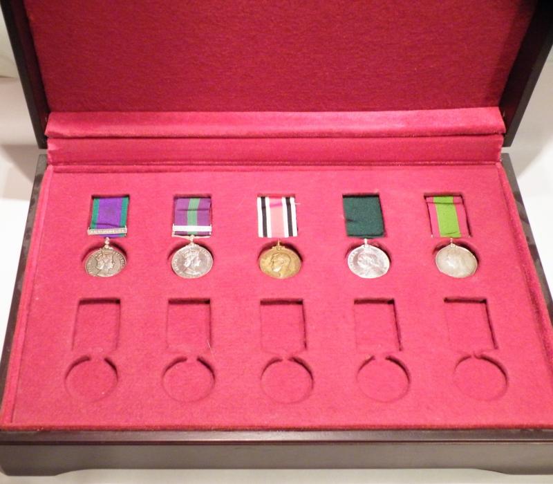 A really handy red velvet interior display/storage box designed to hold ten medals with their ribbons, it comes in very good condition and measures approx 17.75 inches long. Medals not included