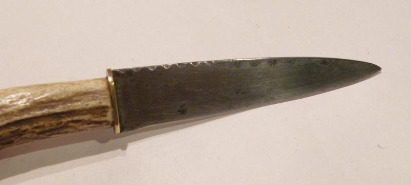 A very nice old handmade Sgian Dubh with stag antler grip, brass pommel and guard and a good steel blade. It comes in its original leather scabbard with brass chape. In very good used condition, measuring 7.5 inches long.