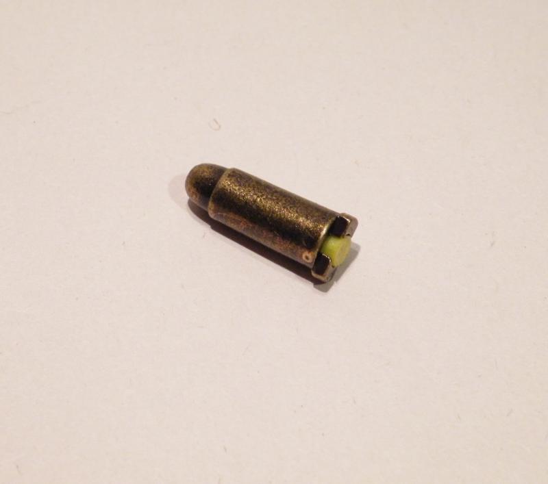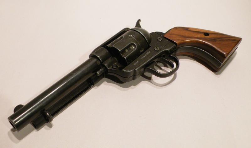 This is the old type Denix replica, the Colt 45 Single Action Army revolver. It is all quality metal with wooden grips and is loaded with dummy bullets which will take a percussion caps. This one is in good working condition by has light wear and signs of use. It measures 11 inches long.