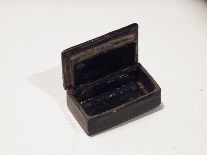 A tiny little snuff box the top inlayed with white metal. A very fine waistcoat pocket snuff in excellent original condition, 1.25 x .75 inches.