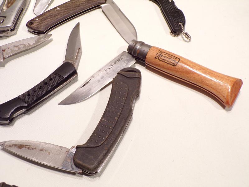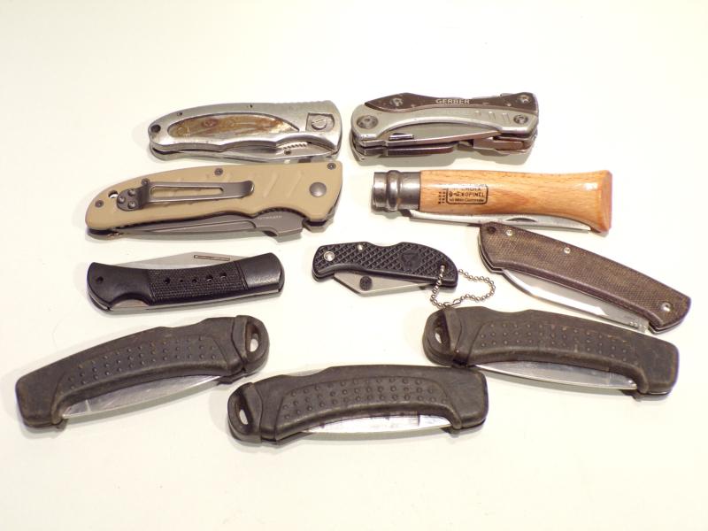 10 various folding knives including Multi blade and camping Knives, some top brands including Choix, Gerber, Magnum, Inox etc all in used condition.