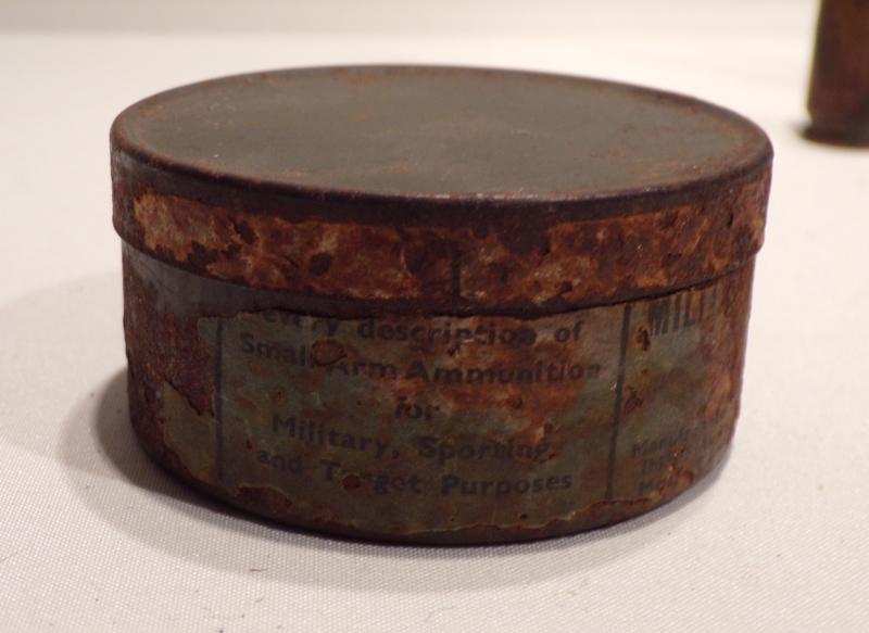 A mixed lot of interesting items which includes a half full tin of vintage musket percussion caps, the tin although rusted still has the residue of a lable around it and the caps are still usuable, with this comes four rounds including a 1975 drill round, two machine gun rounds, these measure just over 5 inches long and a single 1939 dated example, all come in very good condition with signs of age.