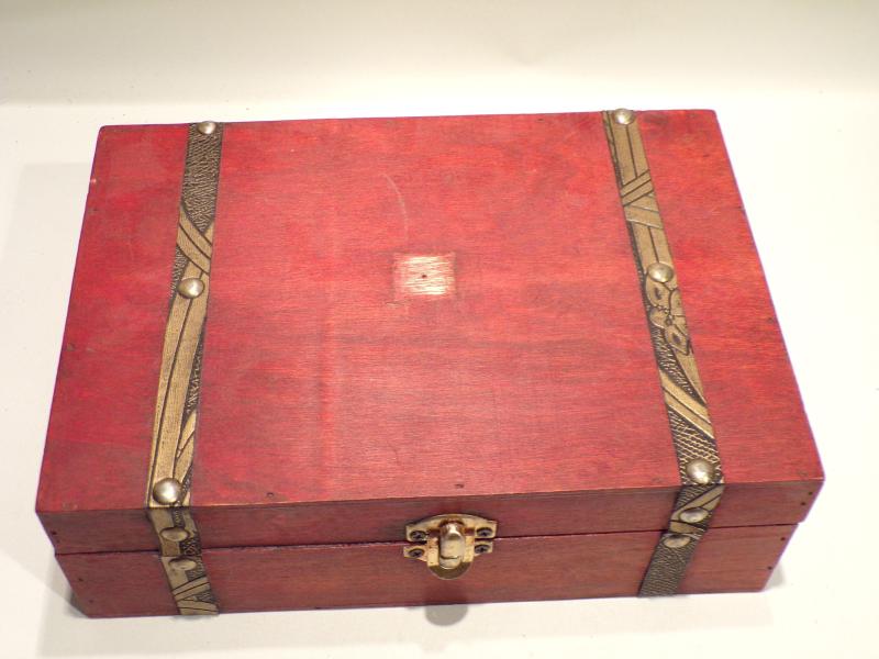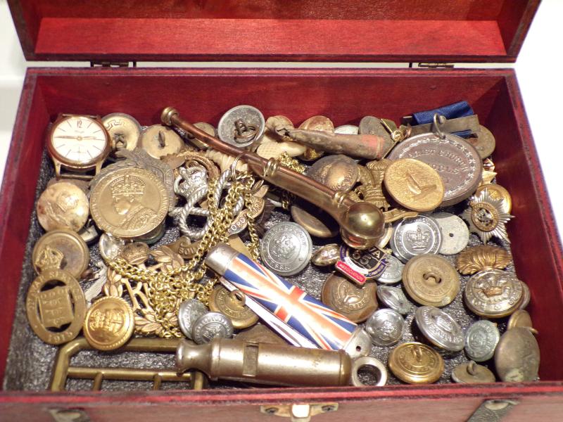 A wooden box containing a host of buttons, badges, medallions and other smalls, you get everything you see. Box measures 9 x 6 inches. Lot 34