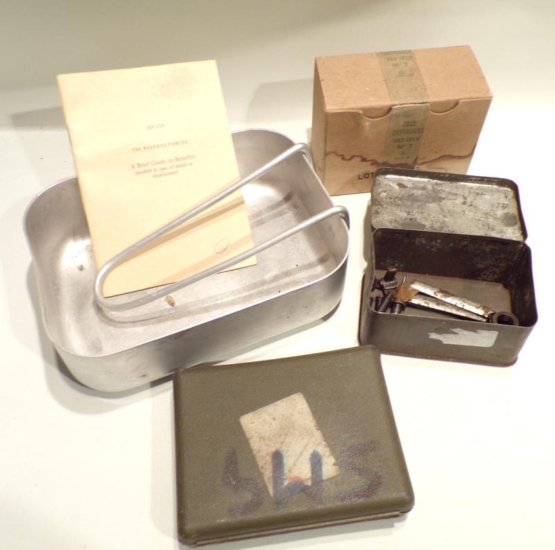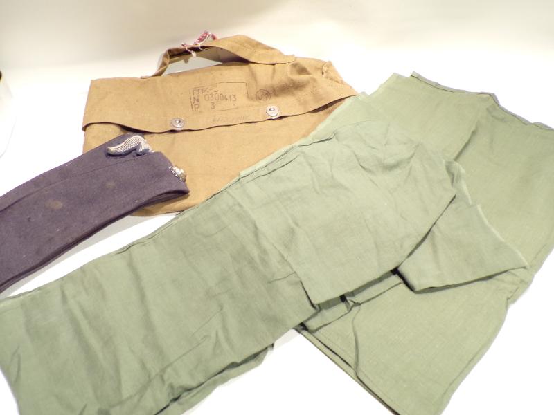 A canvas bag full of goodies, including .303 cartridge box mess tin, military summer scarves or bandannas, bandolier etc, everything in the pictures. Lot 33