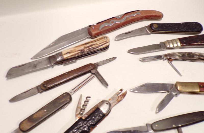 10 folding pocketknives, some with multiple blades and some A/F, all you see in the pictures. Lot 40 Ship to UK Mainland Only. Proof of age required on purchase, over 18’s only.