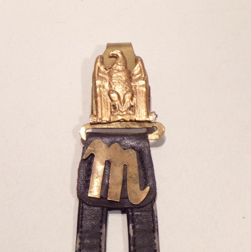 This is an old REPRODUCTION Fascist Italian dagger hanger and not a bad copy, probably produced in the 1970’s it is nice and aged up and toned down. I do not usually sell reproduction items but considering how hard it is to find and the price of hanger for this type of dagger, this one is a good stop-gap with all brass fittings and gilt eagle, measuring 9.5 inches long.