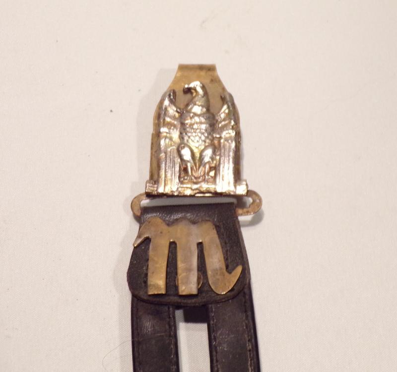 This is an old REPRODUCTION Fascist Italian dagger hanger and not a bad copy, probably produced in the 1970’s it is nice and aged up and toned down. I do not usually sell reproduction items but considering how hard it is to find and the price of hanger for this type of dagger, this one is a good stop-gap with all brass fittings and white metal eagle, measuring 9.5 inches long.