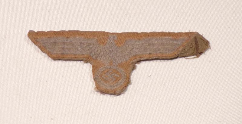 A WW2 era embroidered cap eagle worn on the M40 tropical Feldmutze. This one is a little worn and a bit faded but a rare survivor. It measures 2.5 inches wide.