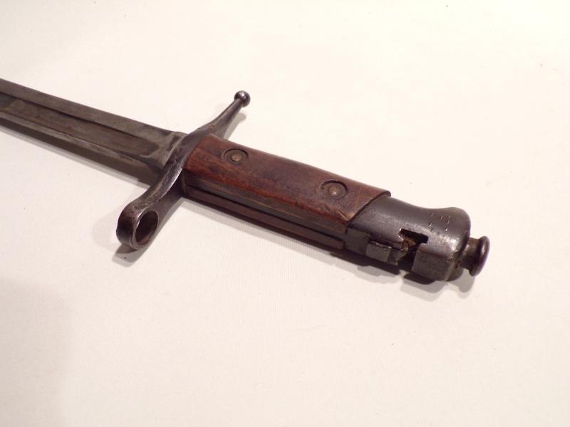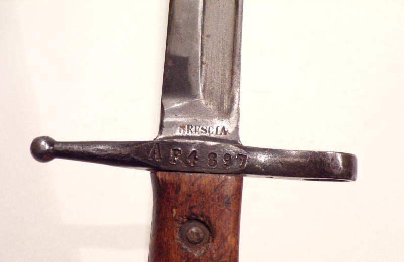 A scarce bayonet made for the 1891 Italian Mannlicher-Carcano Carbine from around 1897, unique by the transverse bayonet lug requiring the bayonet to be placed over the muzzle, then slid sideways on to the bayonet lug from left to right. This arrangement required the bayonet's press stud to be at the rear of the pommel. This one made by Brescia is a good gap filler. The blade was once broken and welded back together, probably in the field. Apart from that, its condition is good but no scabbard. It measures 16.5 inches long.