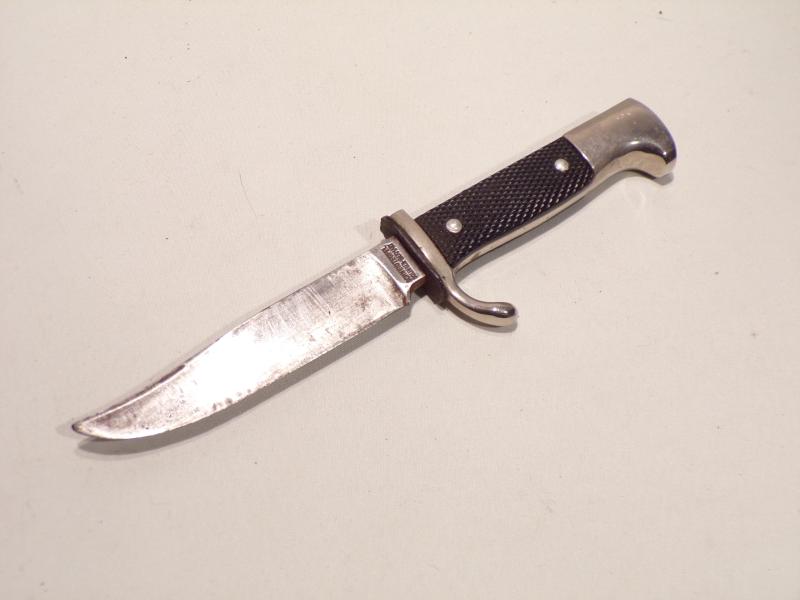 A post war German Youth Scout Knife with later added but original Hitler youth rune. A lovely little knife bearing the makers mark for Schneidteufel Solingen Germany. It is overall good condition and comes in its original leather sheath and measures 8.25 inches long. Sheath has damaged restrainer strap.
