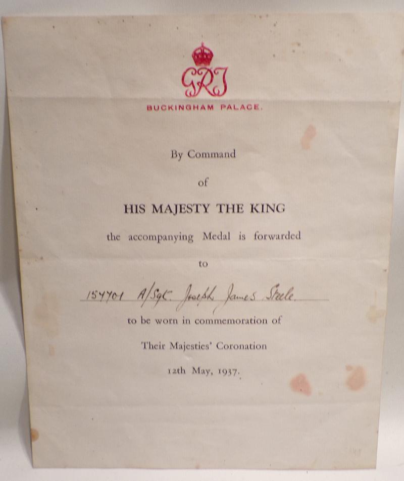 The WW2 medals of the 1939/45 Star, Defence and War medal with MID Oak Leafe awarded to 157701 Warrant Officer Joseph James Steele RAF. 1937 Coronation Medal with award certificate to Acting Sergeant Joseph James Steele RAF. Mentioned in dispatches certificate to Warrant Officer Joseph James Steele RAF. Published in the London gazette on 11th June 1942. Plus, photograph.