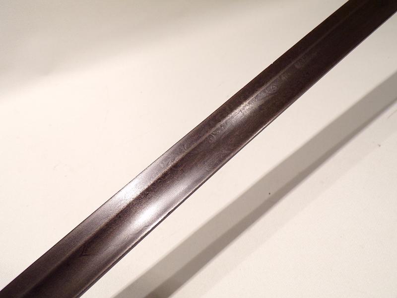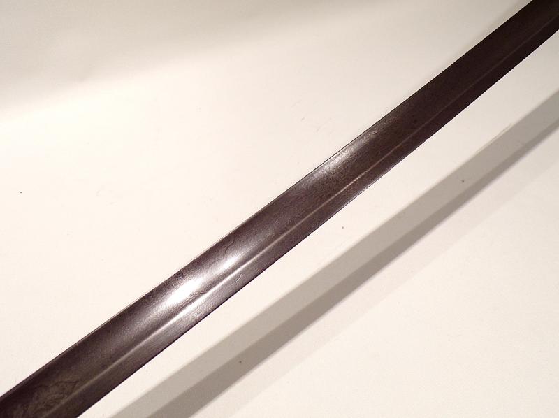 A Victorian Infantry Officers Sword with gilt brass hilt non folding guard, so post 1850. A ray skin grip bound with twisted and two single strand wire. The guard has a light depression in the frame, which is seen a lot with type of sword, probably a result of battle damage. A good slightly curved single fullered blade now with a dark tone, I think this commonly caused by greasing the blade with engine grease, better to use natural Bee’s wax, due to the darkening of the blade the etching is a little faint. No makers details, I can see but a proof mark, used by Robert Mole of Birmingham. It has its original steel, two ring scabbard which is also toned very dark but no rust or pitting on the scabbard or the blade. Very good condition, measuring 38 inches long.