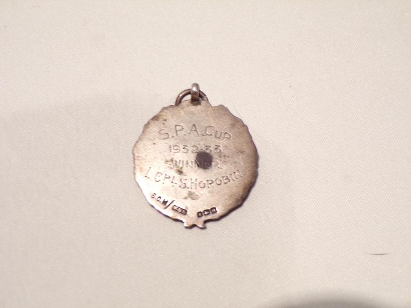 This hallmarked silver medallion was given to Lance Corporal S. Horobin who was the winner of the S.P.A cup in 1932-33, I have not been able to find what the spa cup was but obviously a military event. The medallion is clearly marked on the back and measures just under 1.5 long and weighs 11 grams.