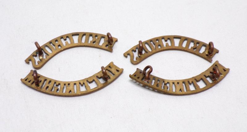 Very good condition pair of brass shoulder titles for the Nottingham Red Cross, each measure 2 inches long.