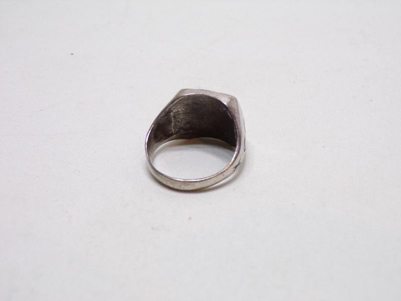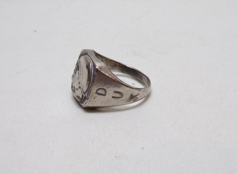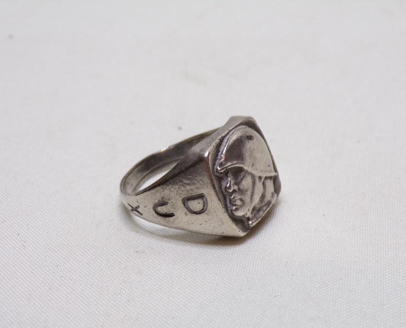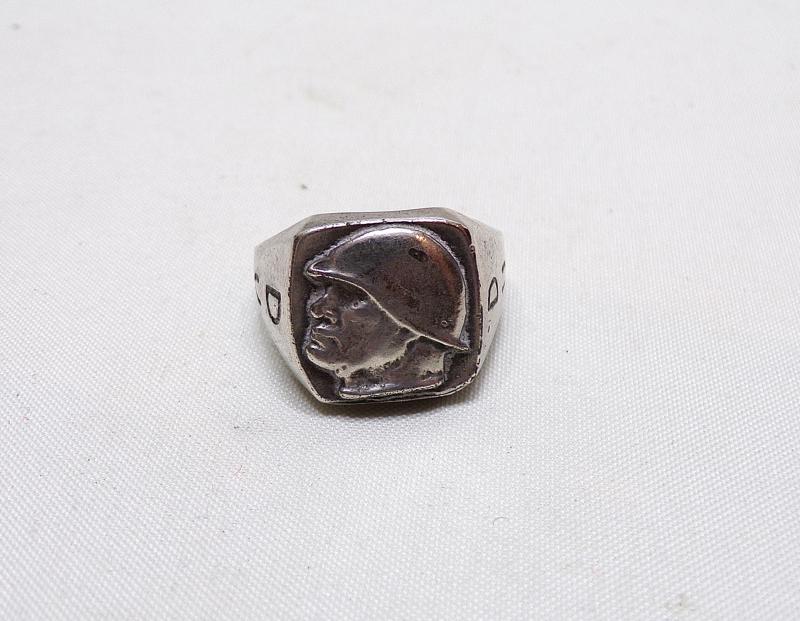 1930’s /40’s Italian Silver (tests around 800g) ring featuring the head of Benito Mussolini with the word ‘DUX’ on both shoulders. It has some signs of wear and use, but a good original piece. Inside diameter 22mm.