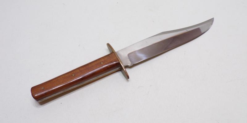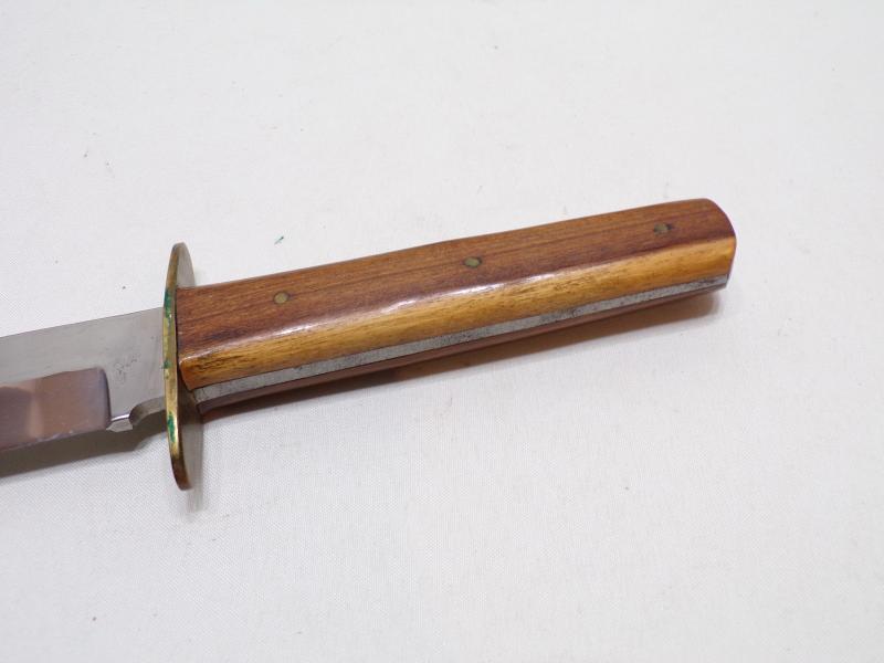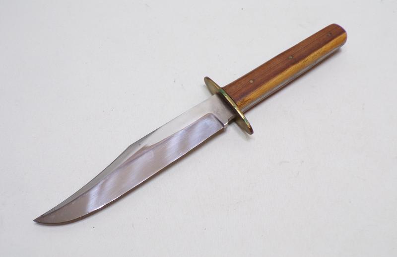 A very nice quality Bowie knife, probably artisan made. An old-style hard wood scales, brass guard and a good clip point blade. No makers mark but in excellent condition with original leather sheath. It measures 10 inches long.