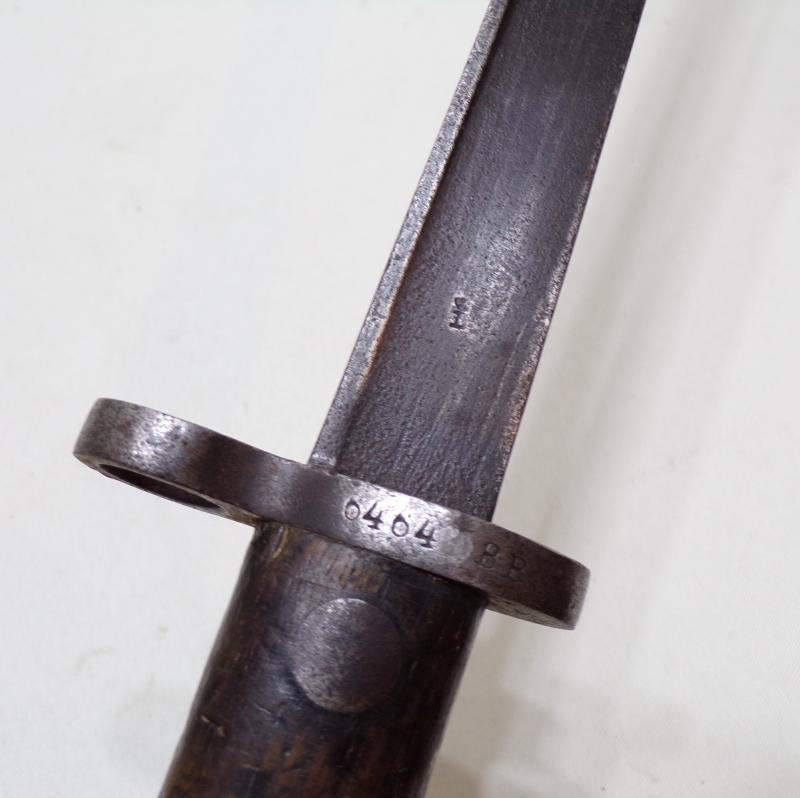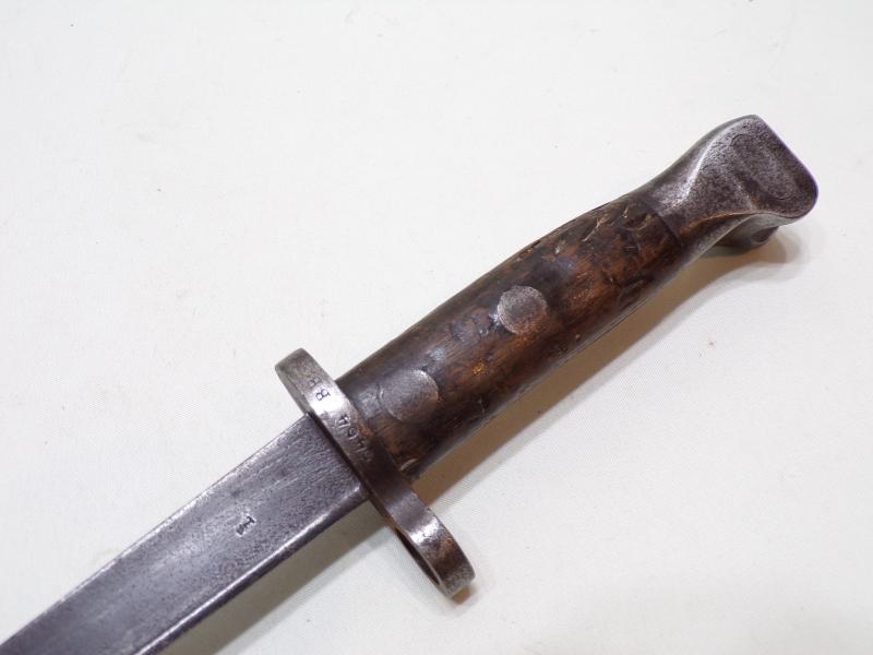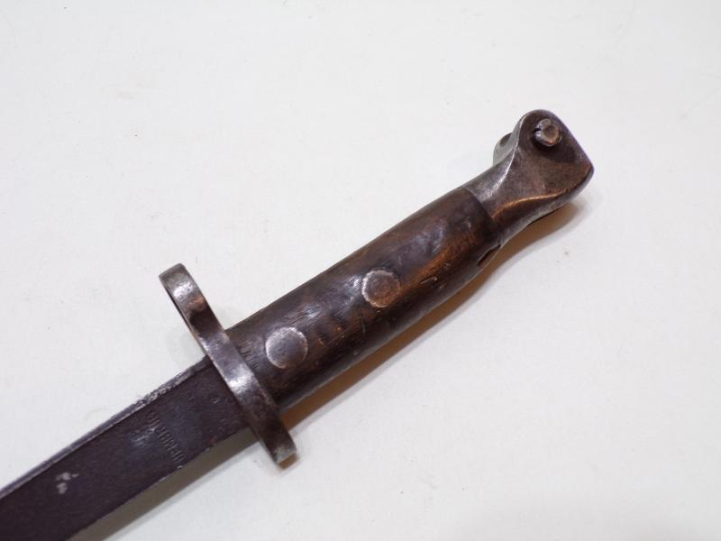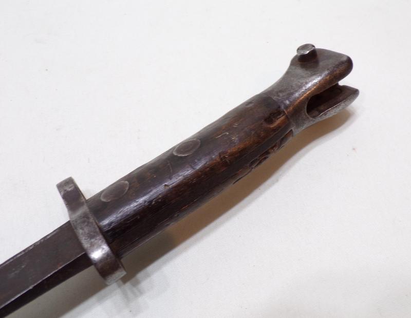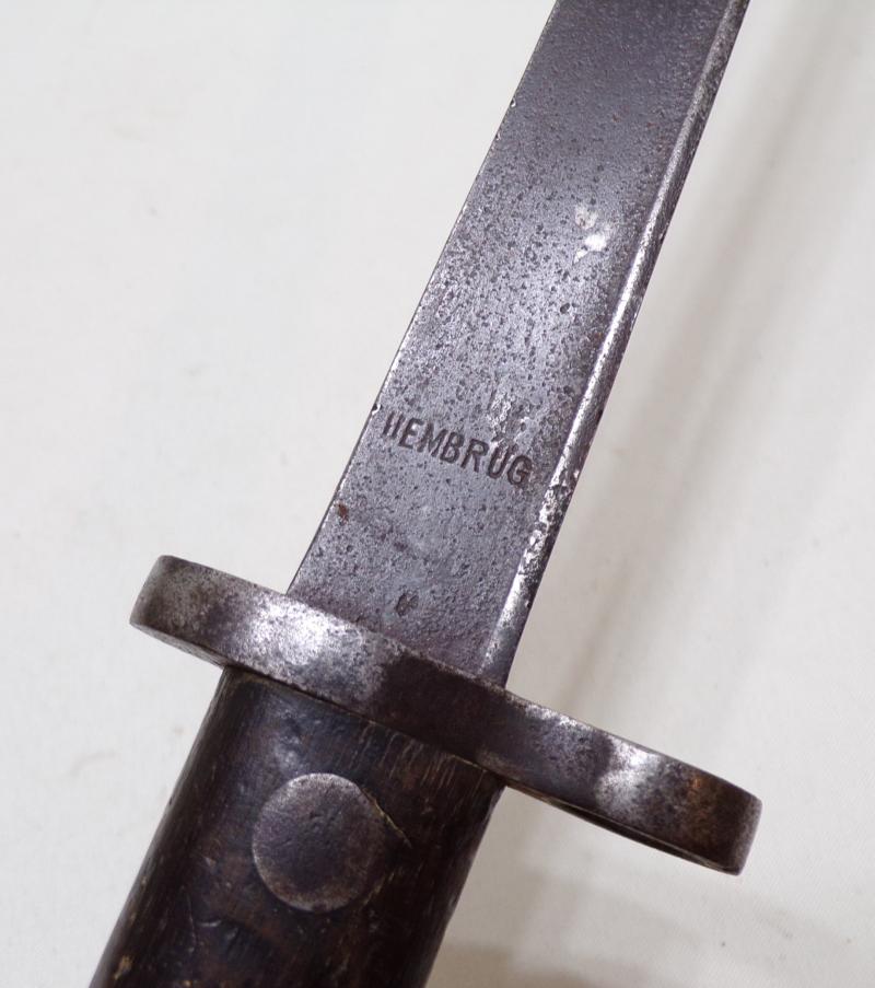 A well-used 1895 pattern Duch bayonet for the 6.5 mm M1895 Mannlicher infantry rifle. It is marked ‘Hembrug’, this was the mark of Artillerie Inrichtingen, in Zaandam. And also marked with the crowned ‘L’ inspection mark, this is attributed to inspector Wiersma. Inspector Wiersma began work c. 1898 and continued into the First World War period. (Ref Worldbayonets.com).