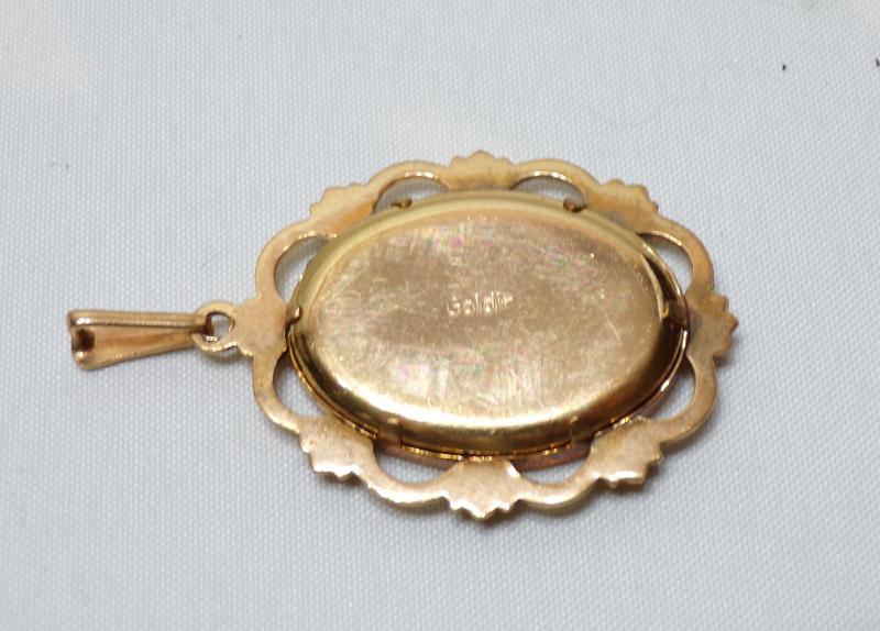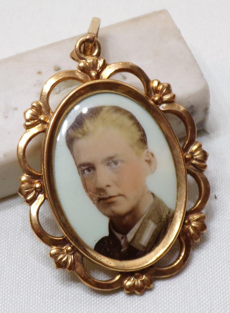 A ladies gold coloured metal pendant with an enamelled photograph in the centre of a young German officer. Probably worn by his mother. It is lovely quality but just marked on the back ‘Goldin’, and comes in excellent condition. It measures 1.25 x 2 inches including suspender.