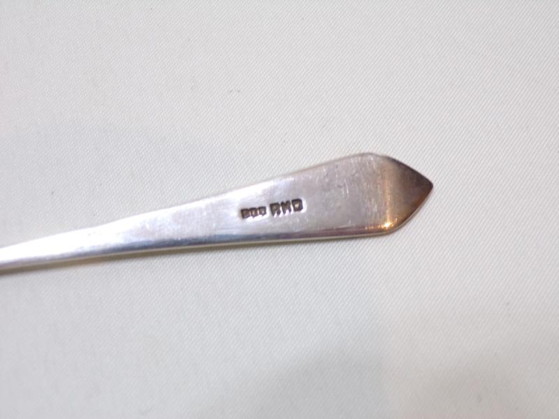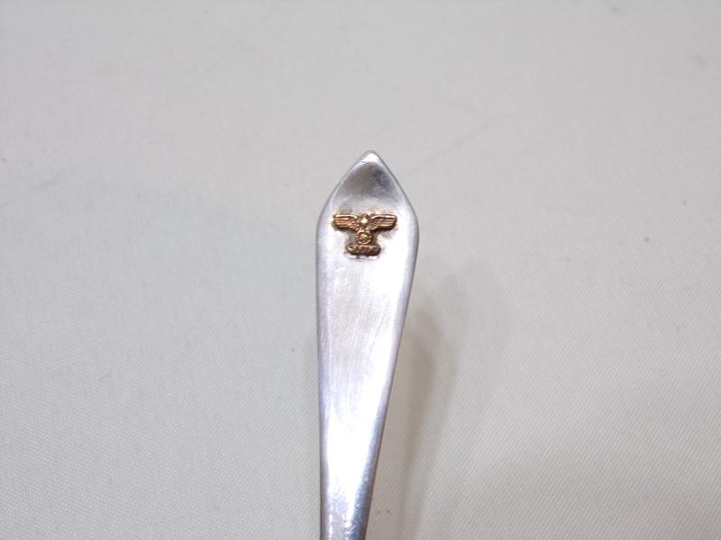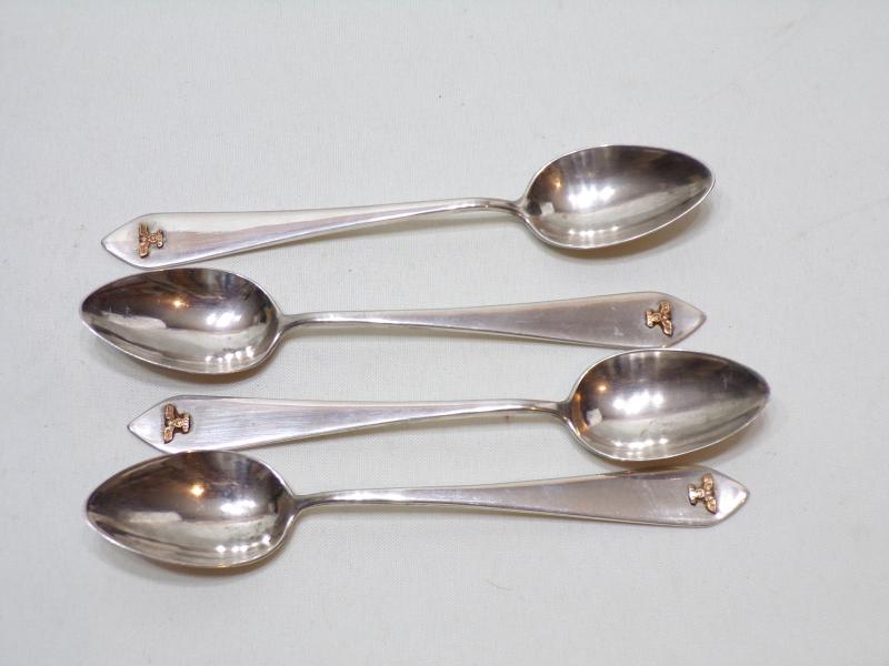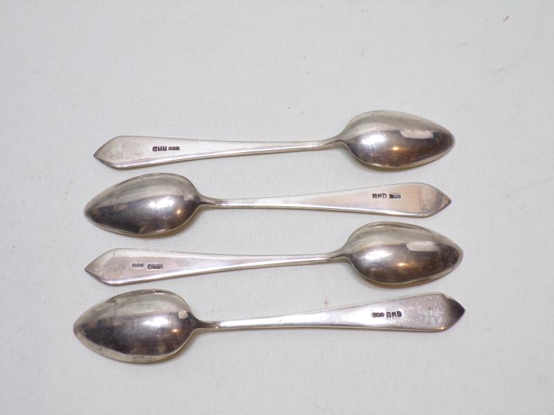 4 scarce 800grade German silver tea / coffee spoons with a pointed terminal and displaying a gold colour eagle at the top, gold eagle too small to test. They are hallmarked on the back 800 RND. In lovely condition, no damage just light signs of use. 53 grams weight.