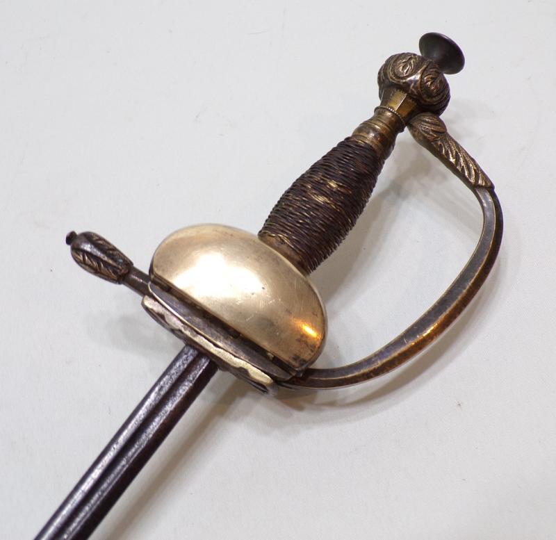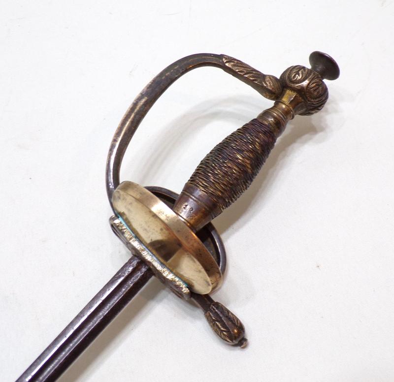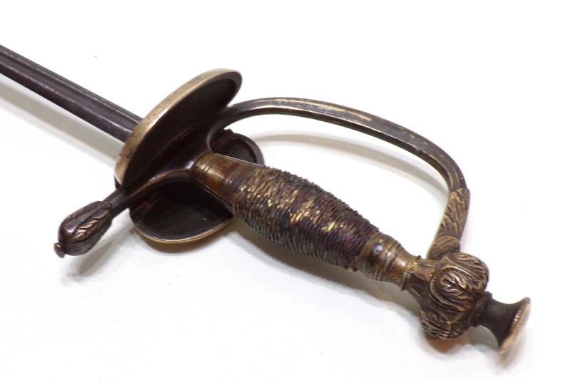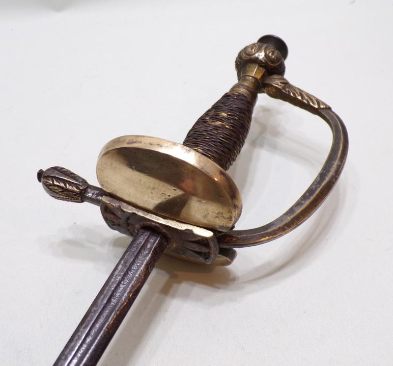 A simple yet attractive 18th Century small sword. Typical light weight dress sword with a solid brass decorative hilt, which would have originally had a gilt finish, an hourglass shaped guard with one side hinged and folds up for comfortable wear, a wire bounded grip and a triangular or trefoil steel blade which terminates to a fine point.