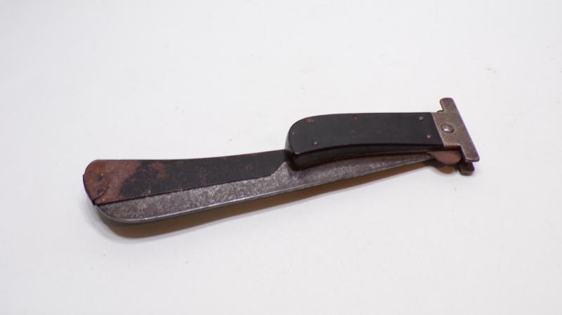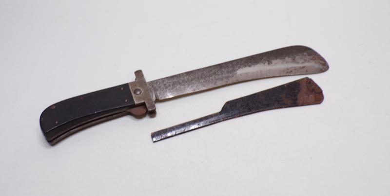 This type of machete was introduced in USAAF emergency kits B-2 and B-4 in 1942, replacing the model 18 Collins machete. This one is in good used condition, manufactured by Cattaraugus USA and comes with its original blade cover. It measures 11 inches when folded and 15.5 when open.