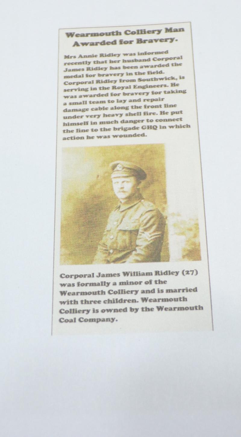 It goes on to say; ‘Corporal James William Ridley (27) was formally a minor of the Wearmouth Colliery and is married with four children. Wearmouth Colliery is owned by the Wearmouth Coal Company. It also shows the same photograph as the original that came with his medals. His military medal was published in the London gazette on 13th March 1918.