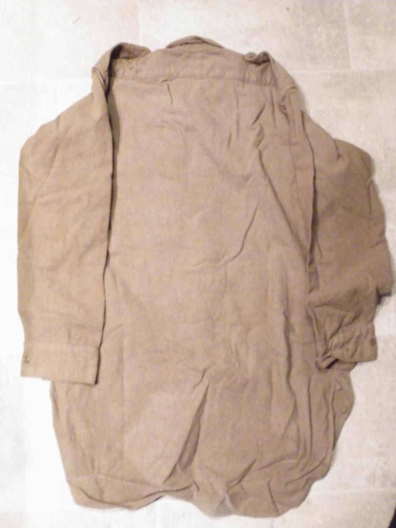Lacking a readable lable I cant offer much information other than it is a WW2 or just after khaki serge shirt with a chest measurement of 38 inches, it shows signs of use and has been worn but is still serviceable.