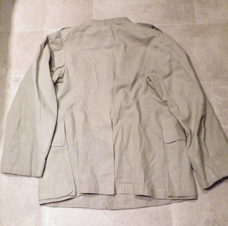 Drab green cotton twill jacket with four pockets and brass general service button and pips. It is in very good used condition with one field repair on the inside. It measures 38 inch chest and waist.