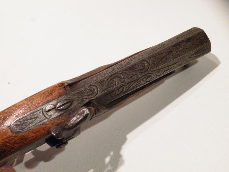A lovely old little replica of a 19th century overcoat percussion pistol. Nice and heavy with engraved barrel, lock and trigger guard. It cocks and dry fires with a working lock and removable ramrod. Solid wood stock with cross hatched grip. It is in very good order with signs of wear and patination. Please note, this is not a Denix.