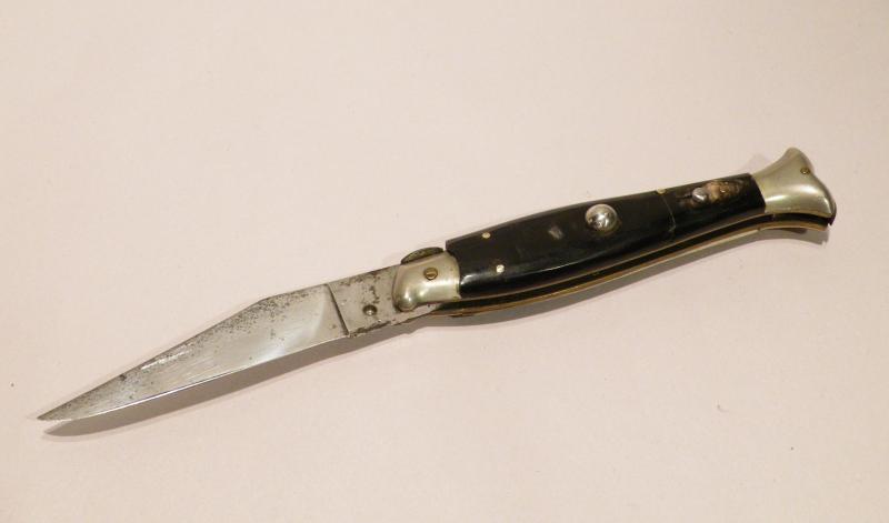 An old locking knife with fishtail end and a locking mechanism when closed and open. It has horn scales and a good steel blade, probably Italian in origin but unmarked. In good used condition, one light hairline crack to the horn on one side and a couple of small chips to the horn on the other. It measures 8 inches when open and 4.5 inches closed.