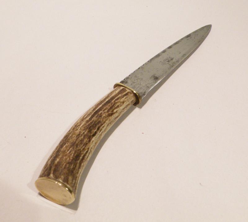 A very nice old handmade Sgian Dubh with stag antler grip, brass pommel and guard and a good steel blade. It comes in its original leather scabbard with brass chape. In very good used condition, measuring 7.5 inches long.