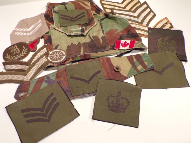 Various current cloth insignia including a Corporal’s camouflage Brassard. All in used condition. Lot 31