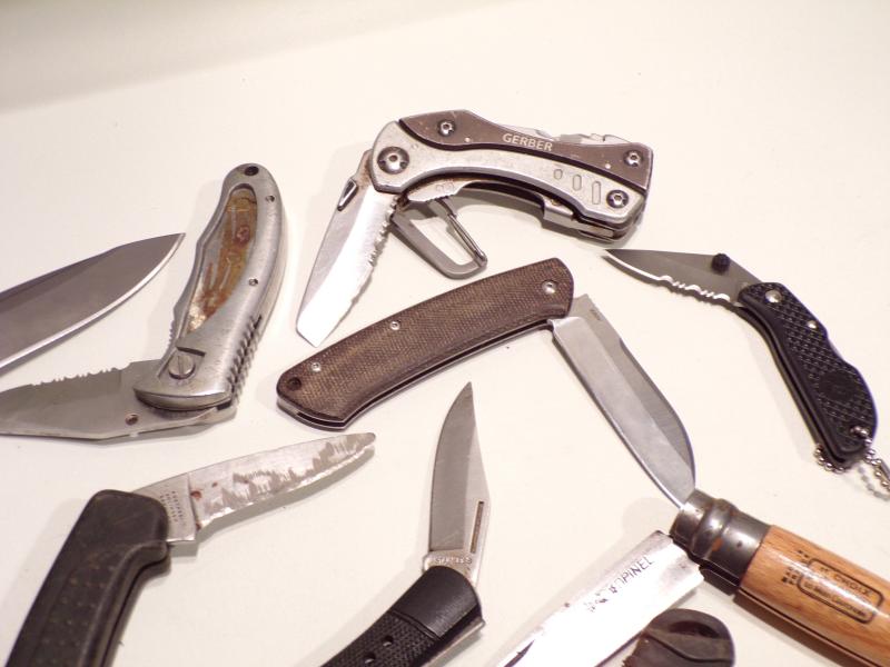 10 various folding knives including Multi blade and camping Knives, some top brands including Choix, Gerber, Magnum, Inox etc all in used condition.