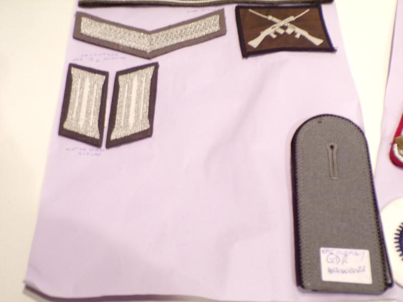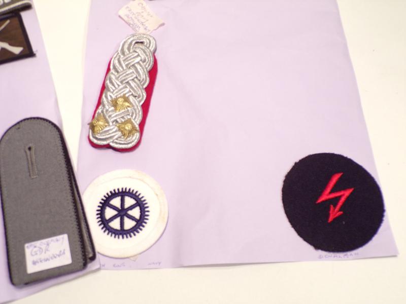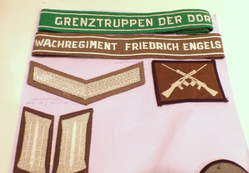 Including original East and West German insignia from the cold war era. It includes cuff bands of the Friedrich Engels Guard Regiment and Border Guard plus collar tabs, shoulder boards, and other insignia. 13 items in all, in very good condition.