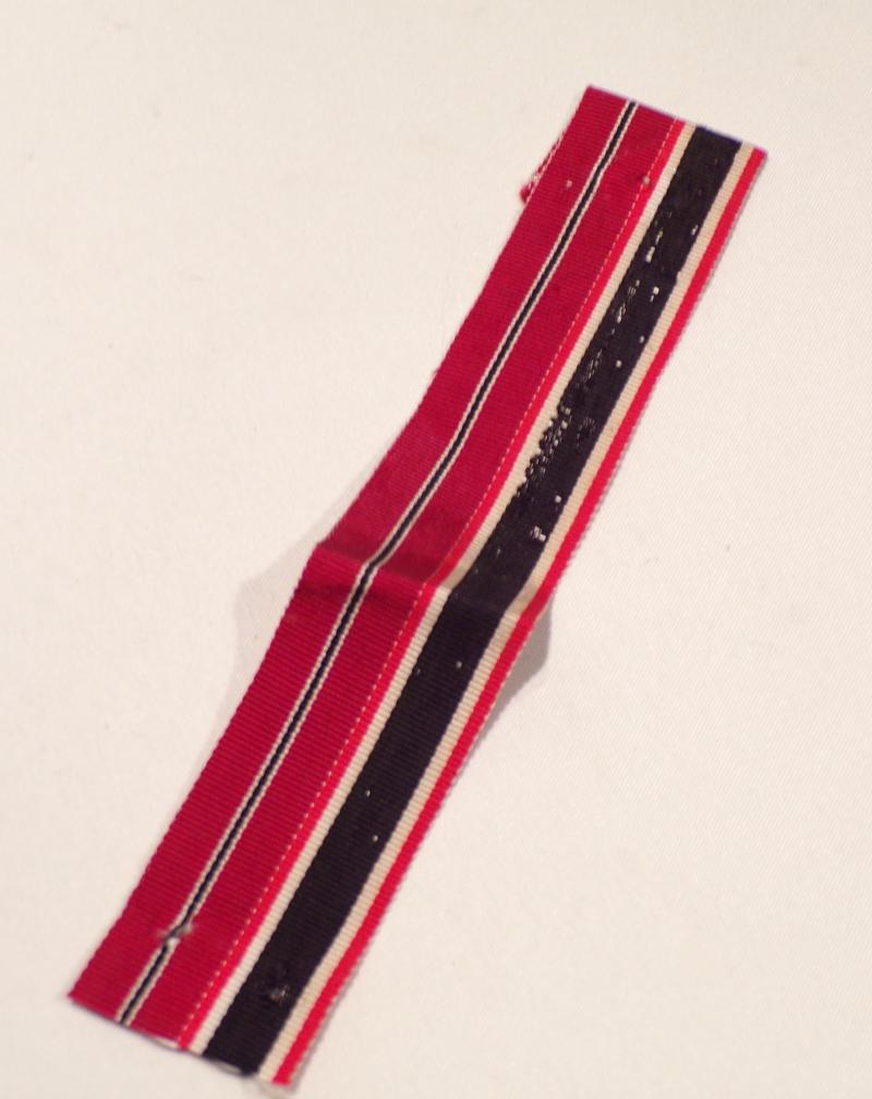 WW2 era double award ribbon of the War Merit Cross and the Eastern Front medal. It was worn through the second buttonhole of the tunic and attached behind. It measures 7 inches long and has two pin holes, where it was attached to a tunic and shows a little wear.