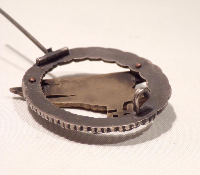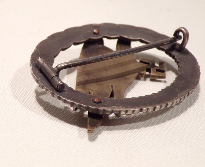 A superb early Luftwaffe paratrooper badge by Brüder Schneider of Wien, with BSW clover leaf mark on reverse. Constructed of a nickel wreath and a gilded brass eagle, both correct for this maker. On the back it has its original pin and clasp, wide hinge, needle pin and bulky wire hook and two small brass rivets holding the eagle, again all correct for this maker. The condition is beautiful with a nice even tone of patination, gilt worn on eagle. It measures just over 1.5 inches by 2 inches.