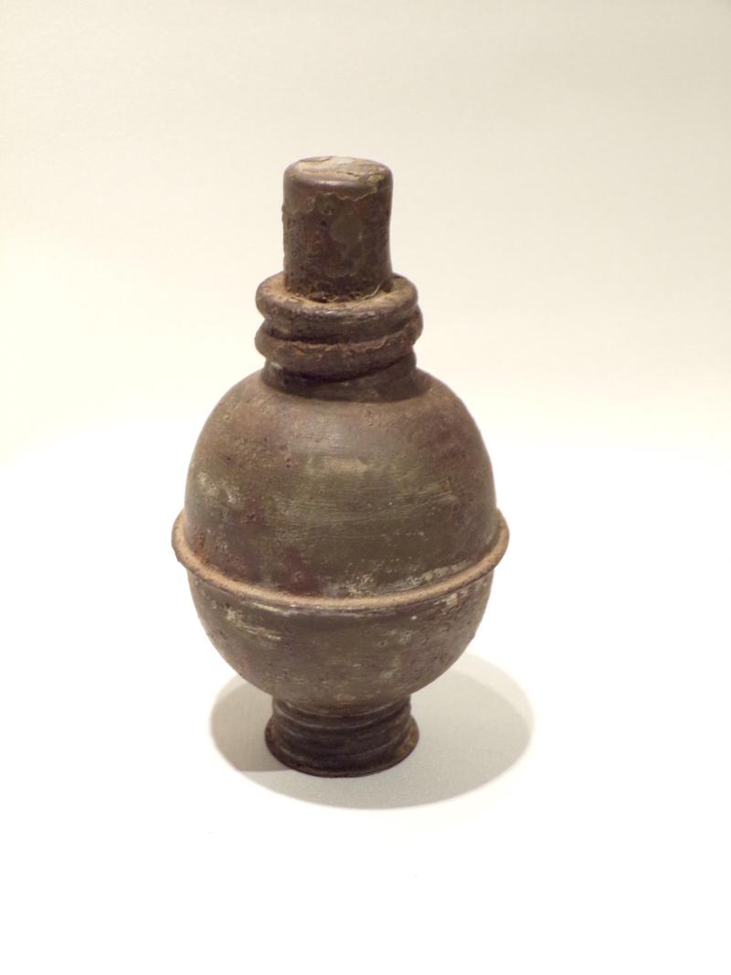 The WW2 era first model Dutch Egg Grenade (Eihandgranaat) for throwing practice. It is made of a light metal, probably tin and filled with sand. These grenades are scarce, but I’ve never seen a practice version before. In good condition, bottom threaded stopper is missing. these must have been smashed to pieces when used due to their light construction, possibly why few survived. It measures 5 inches tall.