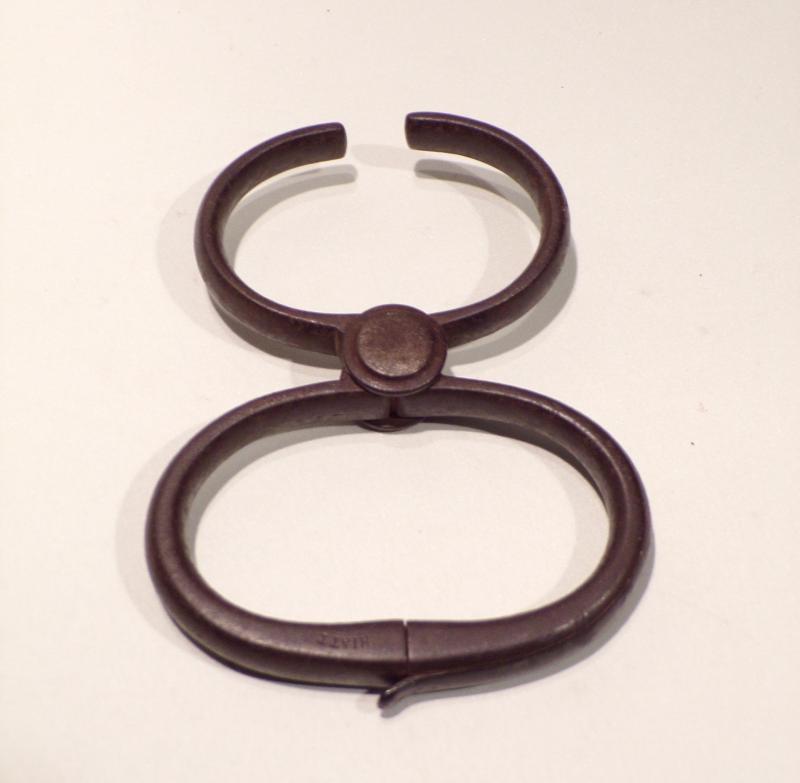 Dating from the late Victorian/Edwardian era these handcuffs were made by Hiatt & Co a well know manufacturer of prison restraints, they are known as ‘come along’ or ‘nipper’ cuffs and are a snap or snatch type utilizing a spring clip locking mechanism rather than a traditional key, made from wrought steel they measure approx. 5.25 long and come in very good condition.
