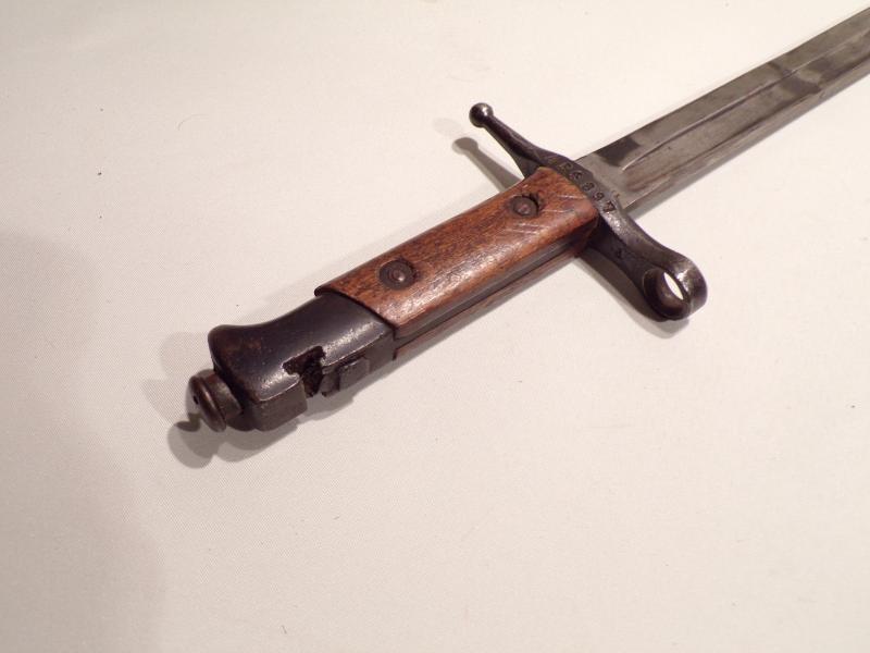 A scarce bayonet made for the 1891 Italian Mannlicher-Carcano Carbine from around 1897, unique by the transverse bayonet lug requiring the bayonet to be placed over the muzzle, then slid sideways on to the bayonet lug from left to right. This arrangement required the bayonet's press stud to be at the rear of the pommel. This one made by Brescia is a good gap filler. The blade was once broken and welded back together, probably in the field. Apart from that, its condition is good but no scabbard. It measures 16.5 inches long.