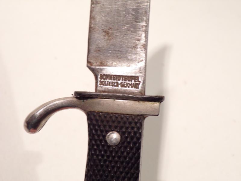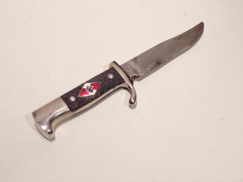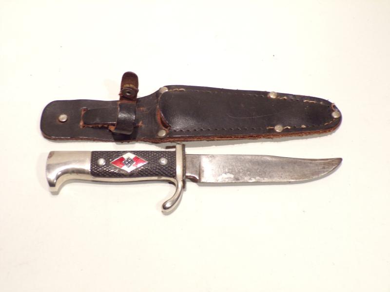 A post war German Youth Scout Knife with later added but original Hitler youth rune. A lovely little knife bearing the makers mark for Schneidteufel Solingen Germany. It is overall good condition and comes in its original leather sheath and measures 8.25 inches long. Sheath has damaged restrainer strap.