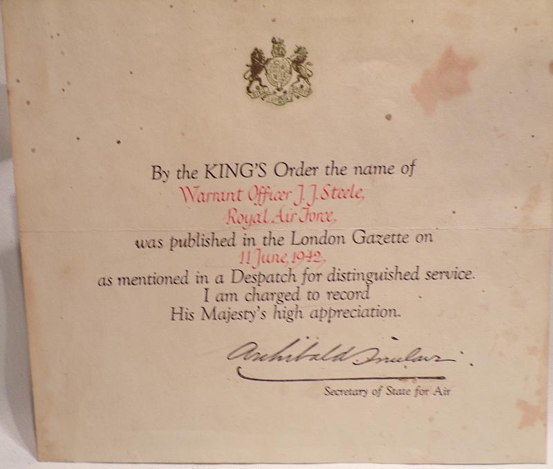 The WW2 medals of the 1939/45 Star, Defence and War medal with MID Oak Leafe awarded to 157701 Warrant Officer Joseph James Steele RAF. 1937 Coronation Medal with award certificate to Acting Sergeant Joseph James Steele RAF. Mentioned in dispatches certificate to Warrant Officer Joseph James Steele RAF. Published in the London gazette on 11th June 1942. Plus, photograph.