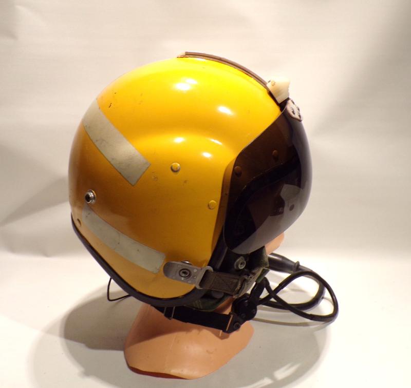 The Mk1 RAF Pilots helmet in bright yellow for Helicopter / Air rescue pilots and crew. This one is dated 1967 with sunscreen and comes with its original cloth inner flying helmet dated 81, communications lead, throat mike and original cloth storage bag. The whole set is in excellent condition and apart from the odd little scuff to the outside, it looks little used. Size No 3 regular.