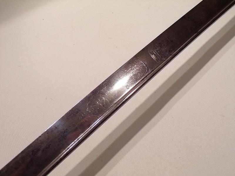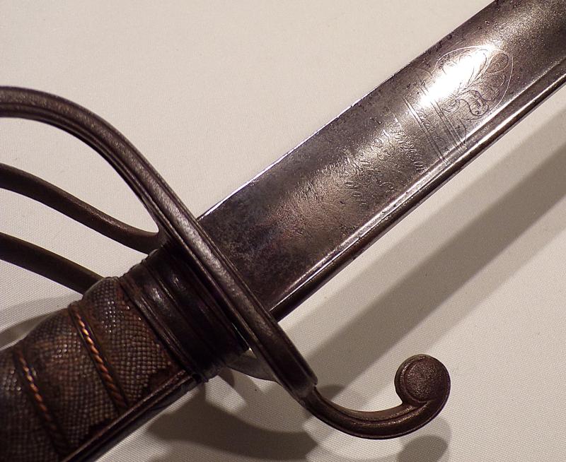 The 1822 pattern light cavalry sword with pipe back and long curved blade, steel hilt with a stepped pommel and ray skin grip bound with twisted wire. It still has traces of etching on the blade showing Queen Victoria’s royal cypher and the makers details of Linney & Son. 23 Regent Street, London.