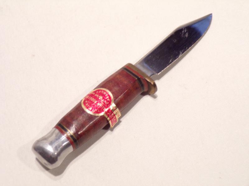 A miniature William Rogers Knife, marked on the blade with ‘Cut My Way’ William Rogers Sheffield England and it also still retains its original label on the leather stacked grip. A very sweet novelty knife measuring just 5 inches long and in perfect condition.