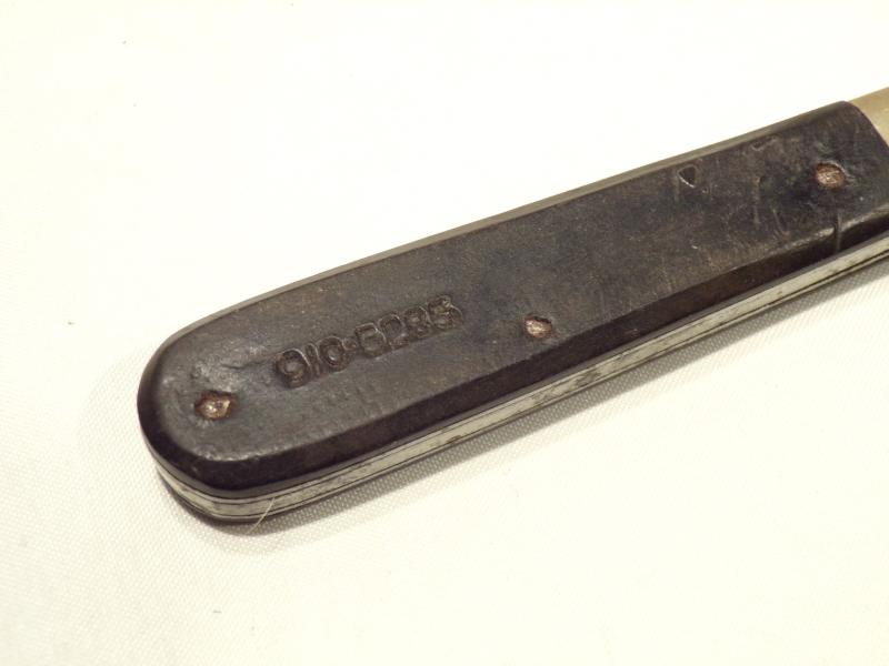 A well-used military knife, possibly an electricians knife it has black scales one side stamped 910-5283. The blade is sharpened one side with a file and notch on top. It is marked with the broad arrow and 1987 Sheffield. In good order but heavily used. It measures 6.5 inches long when open.